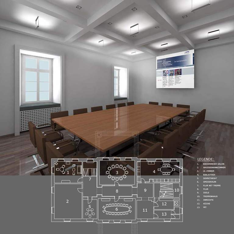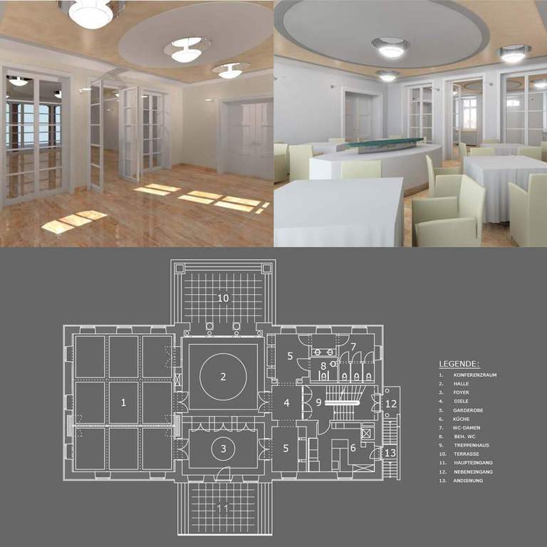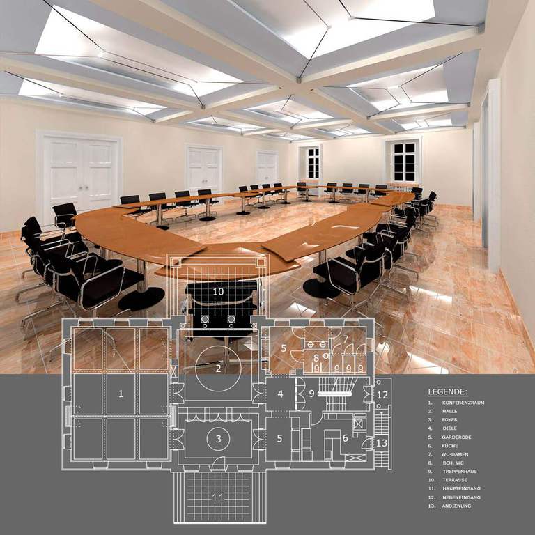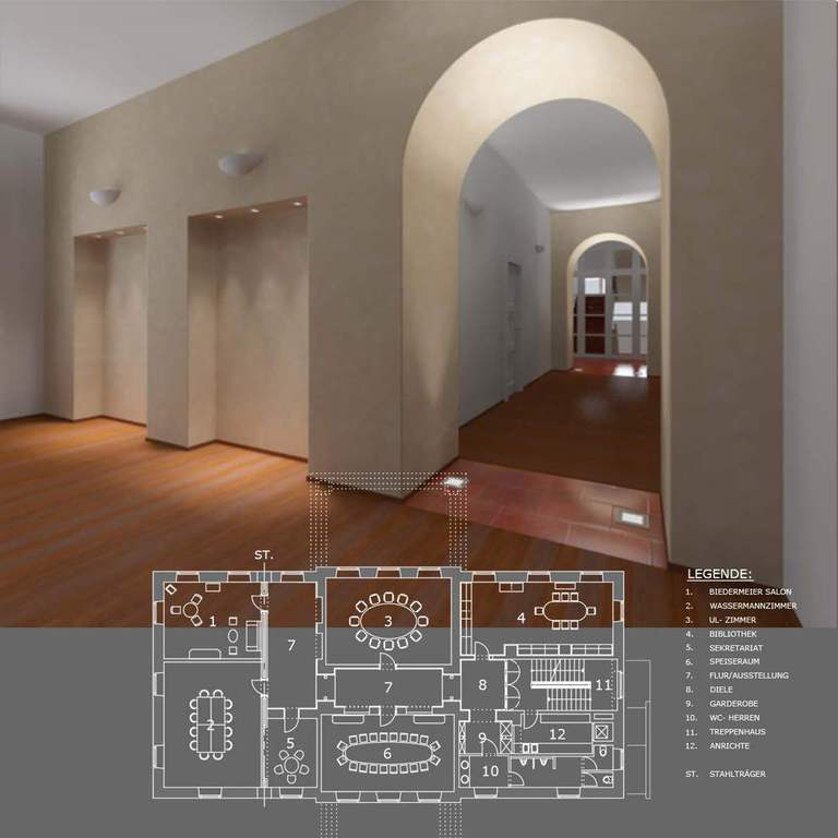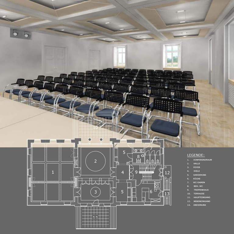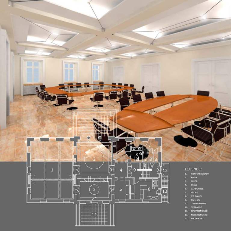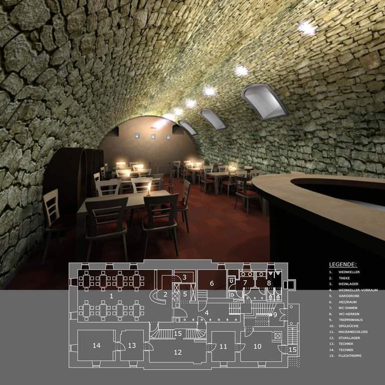 Im Rahmen der Baumaßnahmen wurde das Gebäude nahezu vollständig entkernt. Ziel war es, durch die Zusammenlegung mehrerer Räume einen großzügigen Vortragssaal sowie mehrere Konferenzräume zu schaffen und den Weinkeller neu zu gestalten. Das innenarchitektonische Konzept orientierte sich dabei eng an der bestehenden historischen Substanz: Der Eindruck, alles befinde sich im Originalzustand, sollte bewusst gewahrt bleiben.